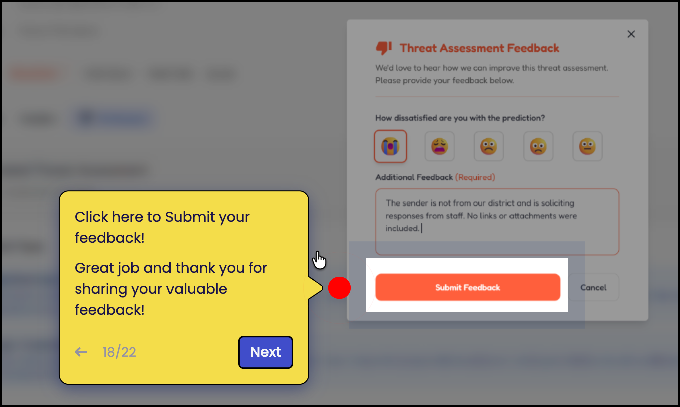 As you review reported threats, you can submit feedback directly within the interface to let us know how the scoring aligns with what you’re seeing in your environment.