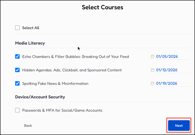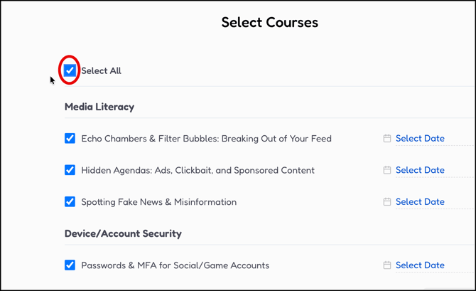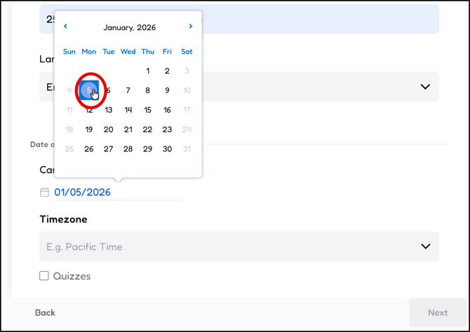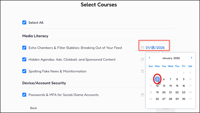 - Click Select Date and click the date you want an email to be sent to students to start the course.