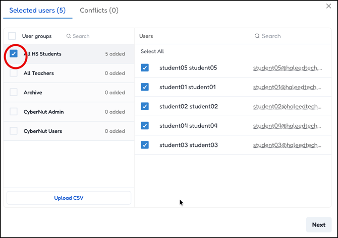 - Check the box beside the group of users in the left side panel. Then select all the users or individuals in the right side panel. Then click Next.