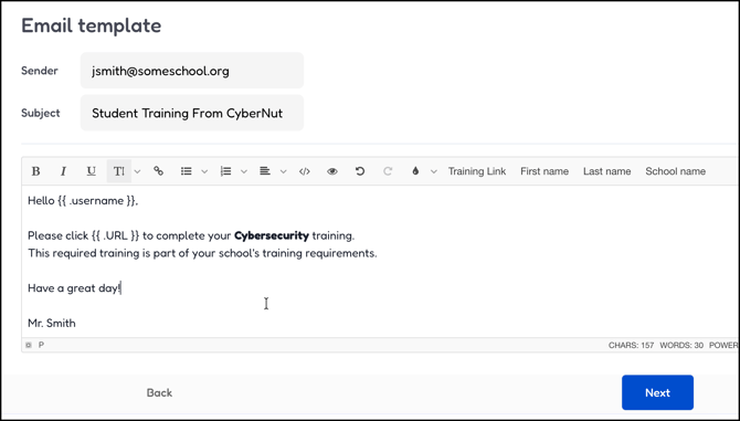 - Modify the Sender, Subject and/or content of the email that students will receive. Then click Next.