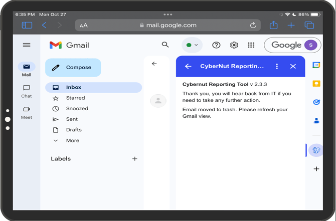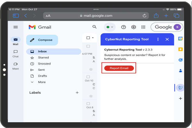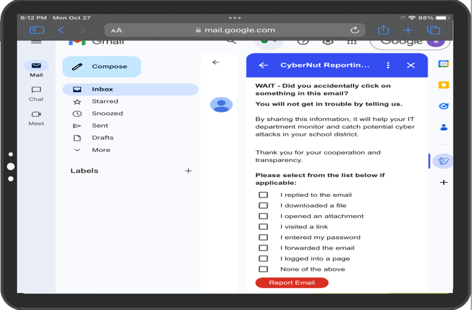 Note: CyberNut relies on the use of a Gmail Add-on. Google does not currently support Add-ons for iPad through Apple's native email app or the Gmail app. However, users can use the CyberNut add-on through a web browser on an iPad.