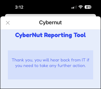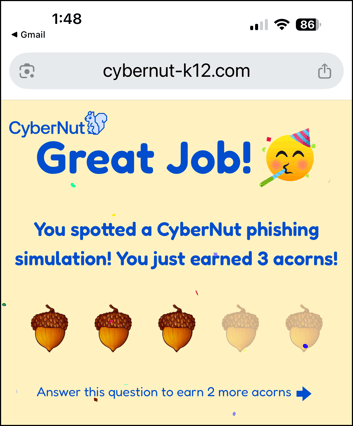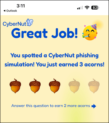 - If the email is a CyberNut phishing simulation email, you will earn 3 acorns.