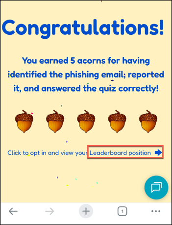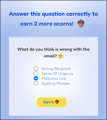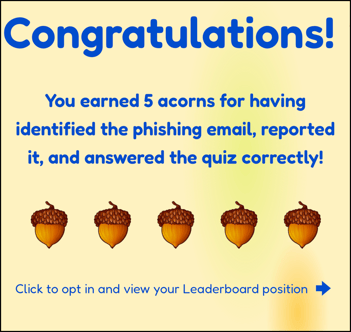 - If the email is a phishing simulation email you will be directed to a site awarding your acorns and asking a question to earn more acorns.