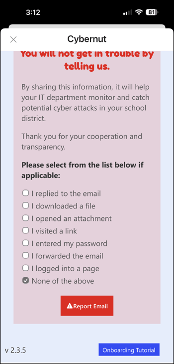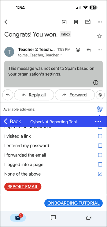 - If the email is not a simulation email this screen will appear. Check any applicable options and click Report Email.