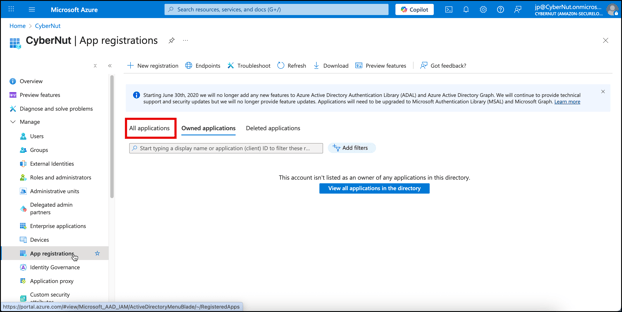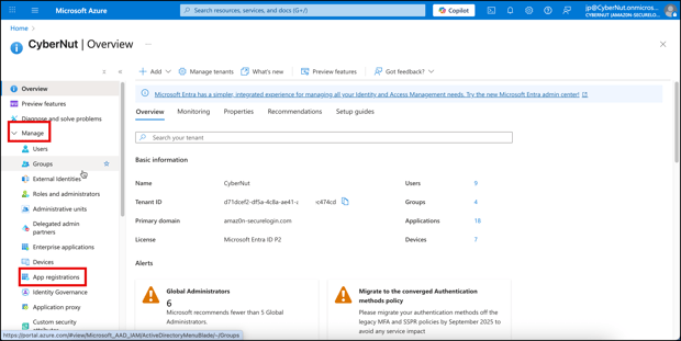 - Click Manage dropdown menu on the left sidebar and click App Registrations.