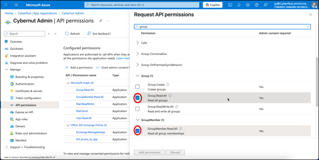 - Search for group and select Group.Read.All and GroupMember.Read.All. Then click Add permissions.