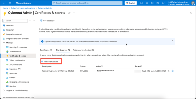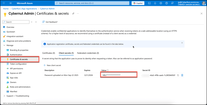 Note: We do not need the Secret ID field. Please ensure you have copied the Value field. You will use this value later in the CyberNut Admin Portal.