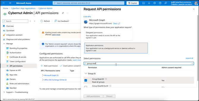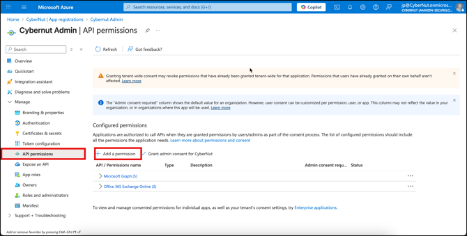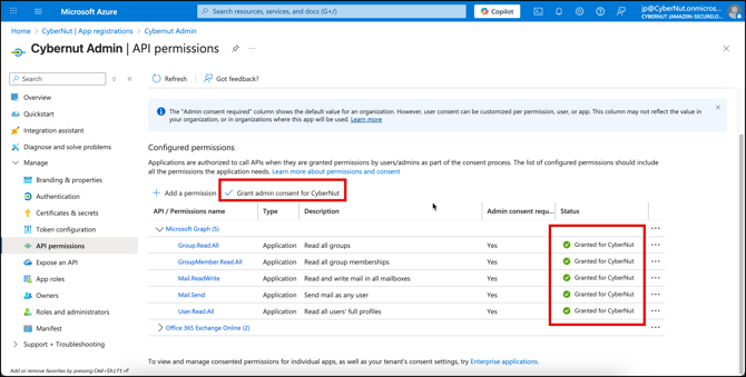 Step 10: Click on Grant admin consent for CyberNut and click 'Yes' on the popup. Verify if your permissions are added and granted as in the image below.