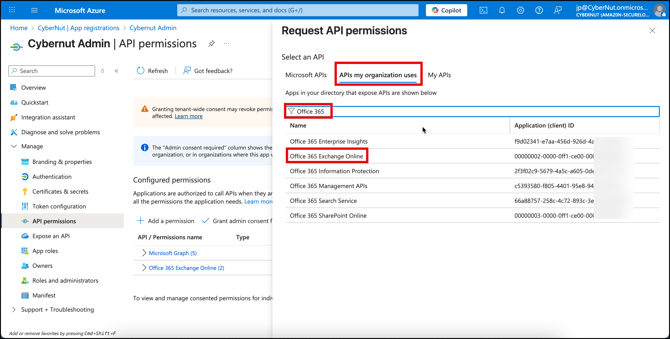 - Enable 'full_access_as_app' and 'Exchange.ManageAsApp' under 'Exchange'.