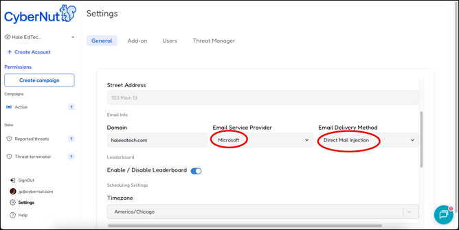 Step 12: After you login click Settings in the bottom left corner. Confirm that Microsoft and Direct Mail Injection is selected and click Save.