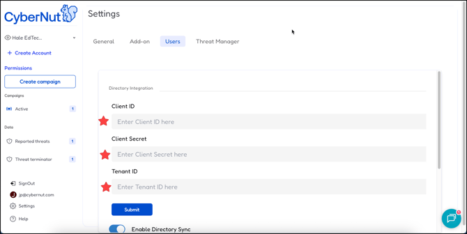 Step 13: Click the Users tab and add your Application (Client ID), Client Secret and Tenant ID, into the CyberNut Admin Portal. Then click Submit.