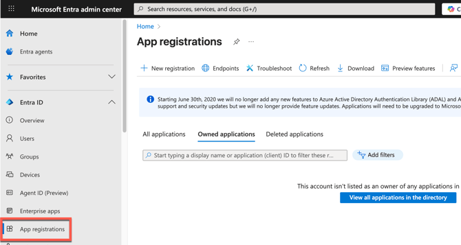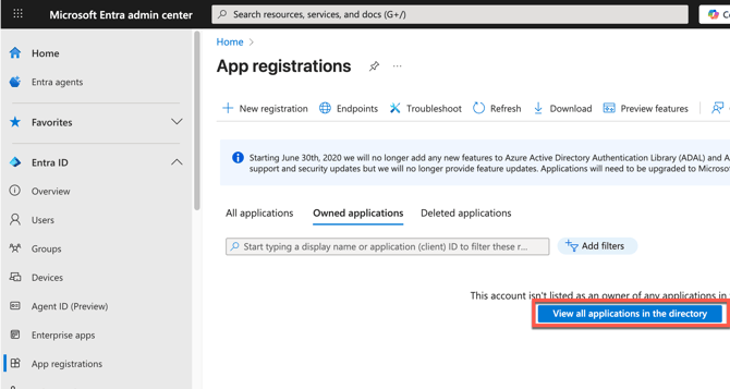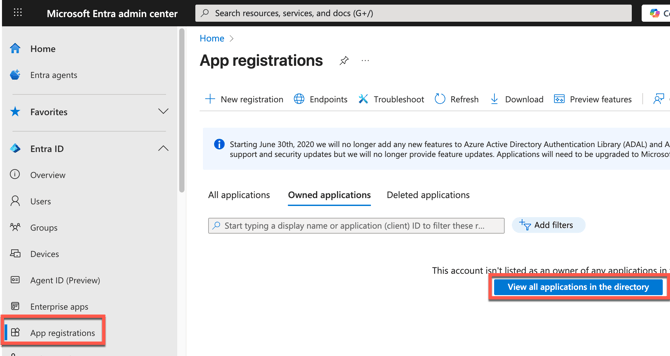 Go to Microsoft Entra admin center at https://entra.microsoft.com/ and click App Registrations and then View all applications in the directory.