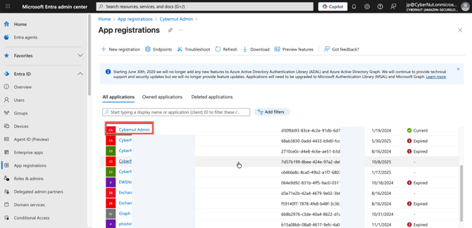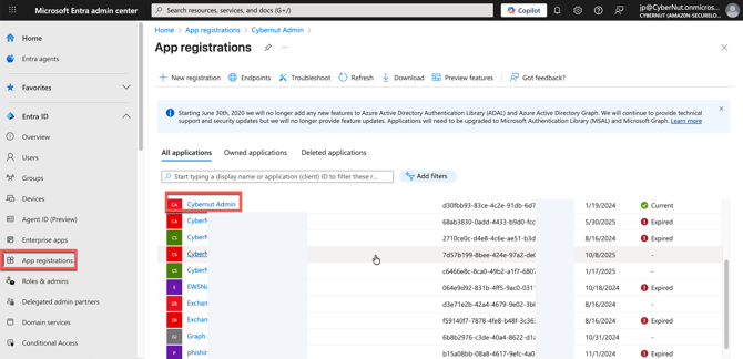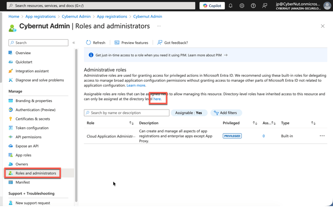 Lastly, please click on Roles and Administrators in your CyberNut Admin app registration and click the blue hyperlink that says here.