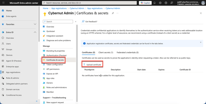 Click Certificates & secrets section, click on Upload Certificate and upload the .cer file you previously generated using the Powershell script.