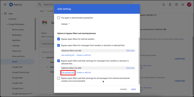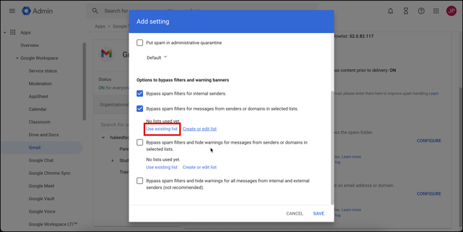 - Check the Bypass Spam Filters and Hide Warnings for messages from senders or domains in selected lists. Click on Use Existing List.