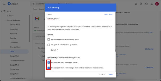 - Name the rule Cybernut Rule. Check the box for Bypass spam filters for messages from senders or domains in selected lists.