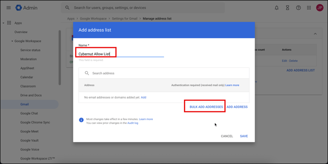 - Name this address list as Cybernut Allow List.