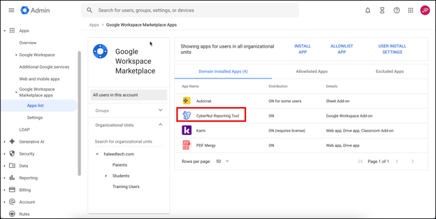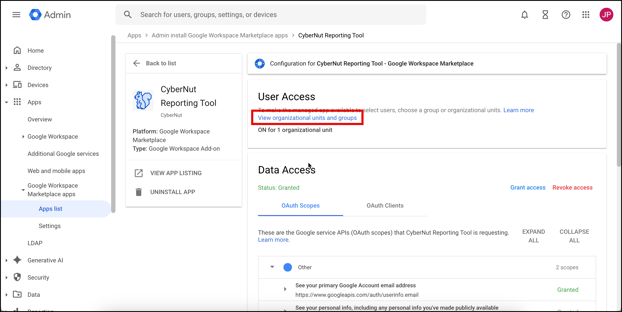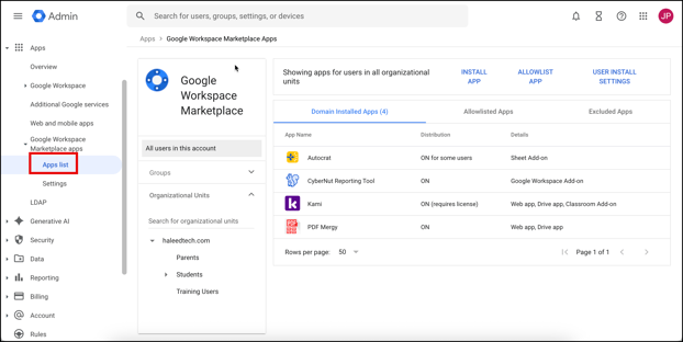 - Select Apps>Google Workspace Marketplace Apps>Apps List from the left sidebar.