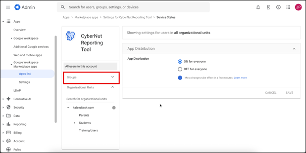 - Search for the group you’d like to deploy the CyberNut Add-on.(ex.CyberNut Admins, Teachers, All High Schools students)