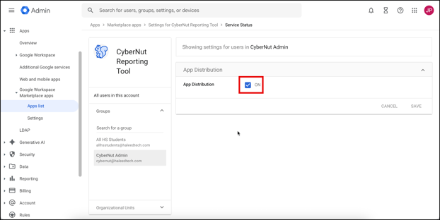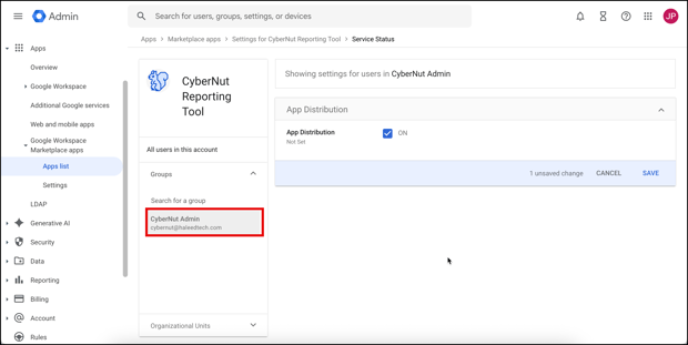 - Select the group and set the App Distribution toggle to on. Then click Save.
