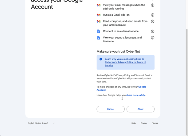 In this article you will learn to grant permissions to the CyberNut Add on for Gmail.