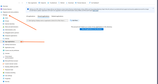 To get started, visit the Microsoft Entra ID Portal and click the 'Manage' dropdown on the left side. Then, click on 'App Registrations'.