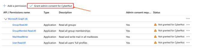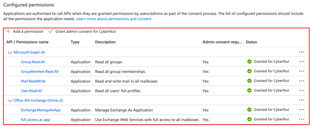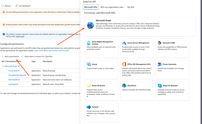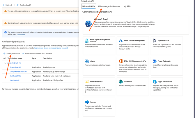 For CyberNut to run without any interruptions, please ensure that you have all of the following API permissions under your 'CyberNut Admin' app registration.