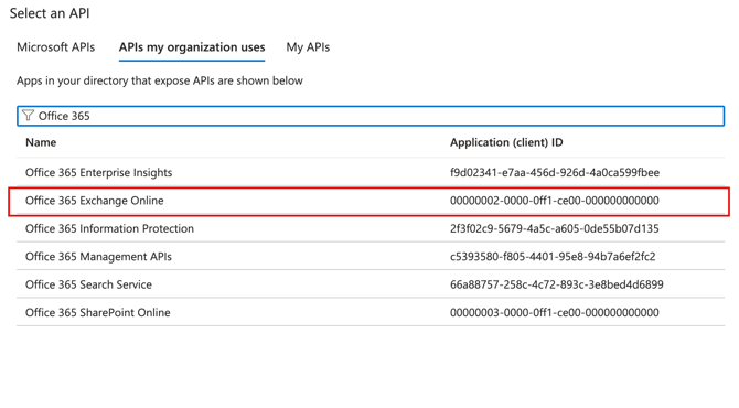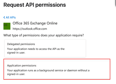 Search for 'Office 365 Exchange Online' in the input field and click on it. Select 'Application Permissions' once again.