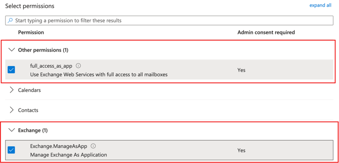 Under 'Other Permissions' please select 'full_access_as_app'. In addition, please select 'Exchange.ManageAsApp' underneath 'Exchange'.