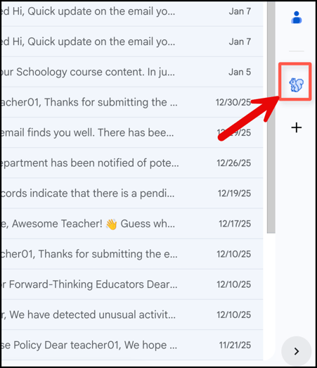 If you are confident your School Technology Administrator has installed the Gmail add-on first, you can locate it by clicking the arrow in the bottom right corner of Gmail.