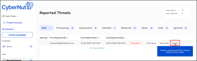 - Select Ignored. This will dismiss reported emails without taking further action.