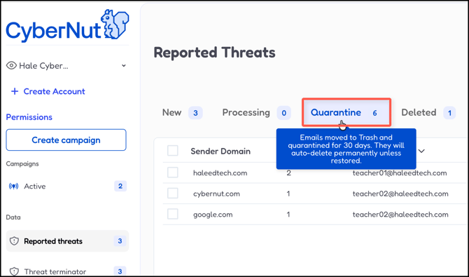 - Click Quarantine. These emails have been moved to Trash and quarantined for 30 days. They will auto-delete permanently unless restored.