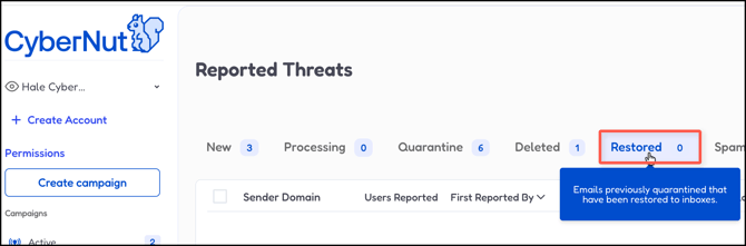 - Click Restored. These emails were previously quarantined and have been restored to inboxes.