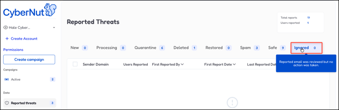 - Click Ignored. These emails have been reported and reviewed with no action taken.