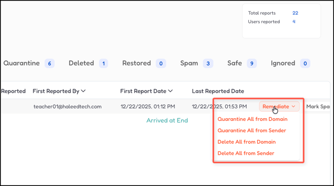 - Restored- Emails previously quarantined that have been restored to inboxes.