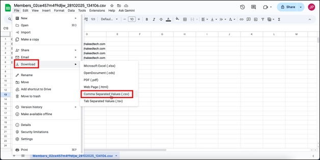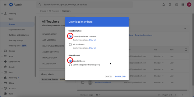 - Keep all selected columns, choose Google Sheets as the format, and click Download.