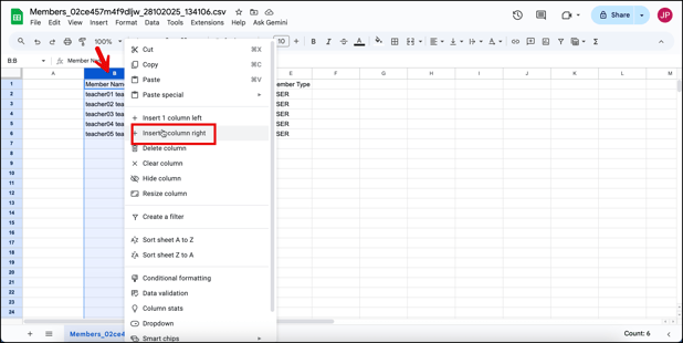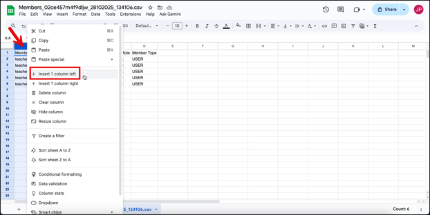 - Format the data according to CyberNut requirements. Start by selecting Column A and inserting a column to the left.