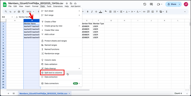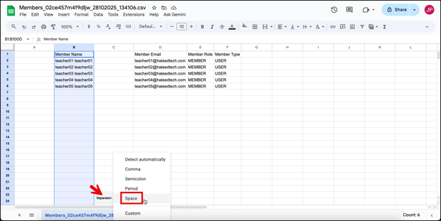 - Select Column B and Split text to columns so the First and Last Name will be in Column B and Column C.