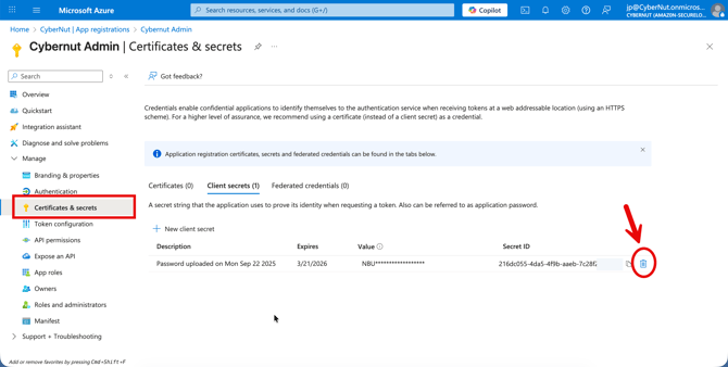 Step 5: Navigate to Manage, click Certificates & Secrets. Delete the old secret.